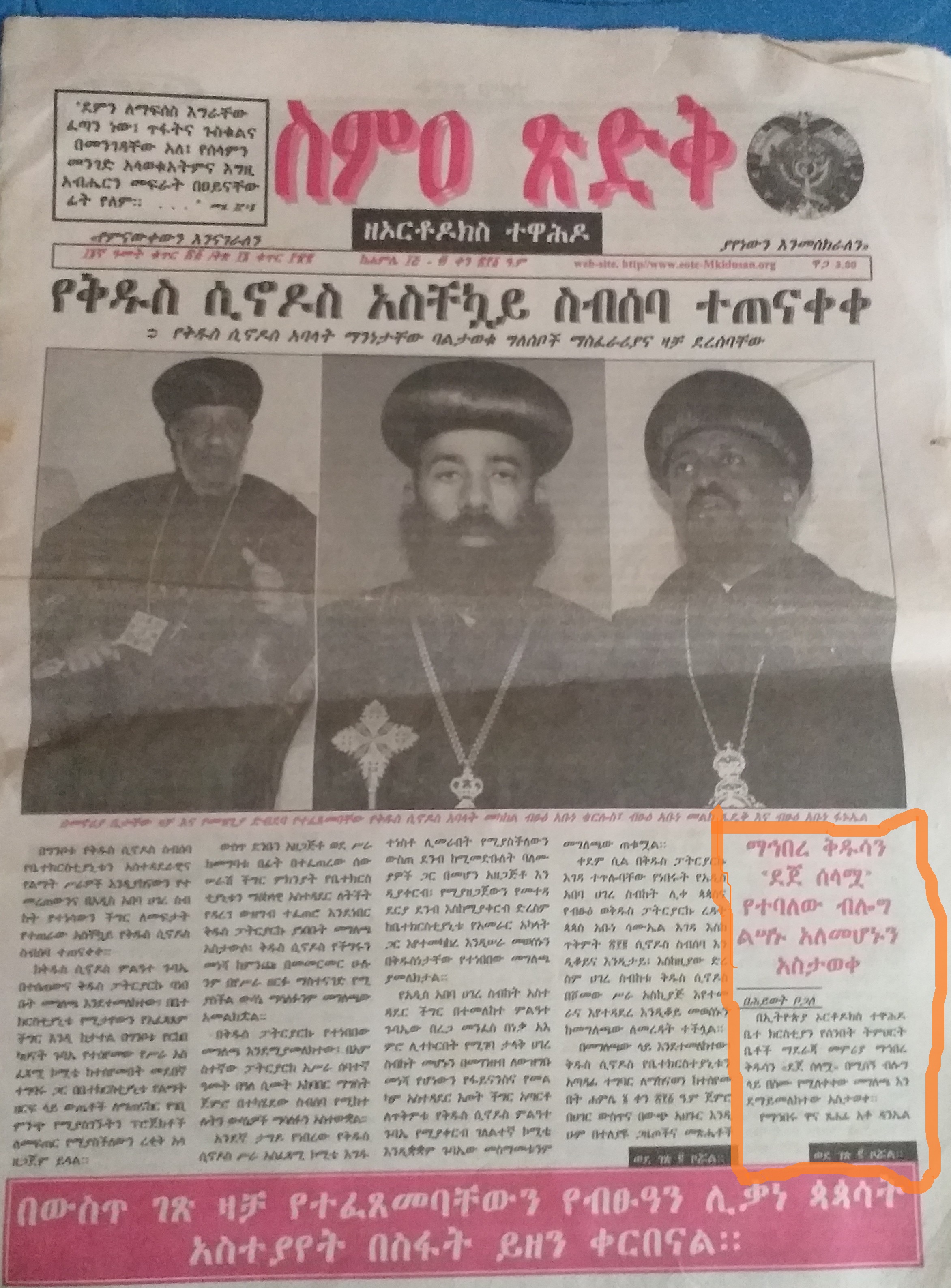 - ከዚህም በተጨማሪ በማንም ይጻፍ በማን የእኔ ጉዳይ ባይሆንም በሊቀ ጳጳስ አቡነ ዲዮስቆሪዮስ ተጻፈ የተባለው ‹‹ፍኖተ ጽድቅ ዘኦርቶዶክስ ተዋሕዶ›› በኮታ የመሸጥ ግዴታ ላለባቸው የአዲስ አበባ አድባራትና የሳሚ ሮቶ ትንሣኤ ማተሚያ እንጂ ለመጽሐፍ ሻጮች ሳይሰራጭ የመቅረቱ ጉዳይ አስራ ምናምን ገጽ አከባቢ ከመናፍቃን መጽሐፍ የተገለበጠ መሆኑንና ‹‹መጽሐፉ የእኔ ነው›› ባይ በመምጣቱ መሆኑን ስሰማ አባቶቻችን ምን ነካቸው? ማለቴ አልቀረም፡፡በዚሁ ግን በሁለተኛ ዕትሙ ላይ ታርሞ እንደሚወጣ አምናለሁ፡፡ለመናዬንም ለማቅረብ እወዳለሁ፡፡