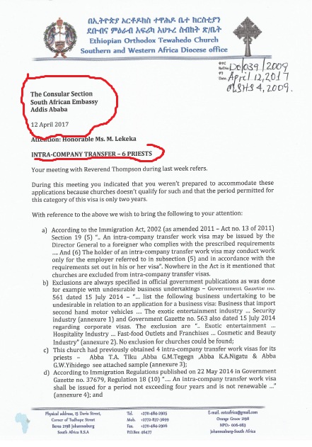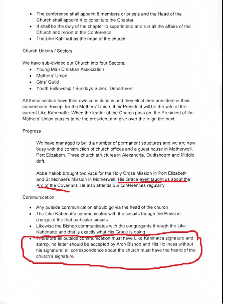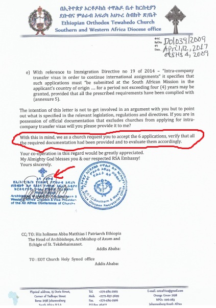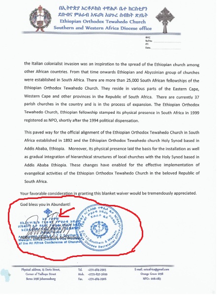 - በብፁዕ አቡነ ያዕቆብ ሥር ከሚገኙት አብያተ ክርስቲያናት መካከል አንድም ቤተክርስቲያን በኢትዮጵያ ኦርቶዶክስ ተዋሕዶ ቤተክርስቲያን ስም እንጂ ልክ እንደ አሜሪካው በአቡነ፣በአባ፣በቄስ እገሌ ስም ግብር ከፋይ ሆኖ የተመዘገበ አለመኖሩና ሁሉም በግበረ ሠናይ ተቋምነት የተመዘገቡ መሆናቸው እጅግ የሚያኮራ ነው፡፡በዚያ ላይ የደቡብ አፍሪካ ቤተክርስቲያን ፈቃድ ታክስ ባለመክፈላቸው ሊሰረዝ ነው የሚለው ውዥንብር ለማጣራት የቅርብ መረጃ ከሊቀጳጳሱ ወይም ከቅርብ ወዳጆቻቸው ማግኘት ባልችልም የደቡብ አፍሪካው ሁነኛ ምንጬ እጁ ላይ ያገኘውንና የላከልኝን እ.ኤ.አ በ2017 የተሰጣቸውን ማረጋገጫ ማየቱ በቂ ይመስለኛል፡፡