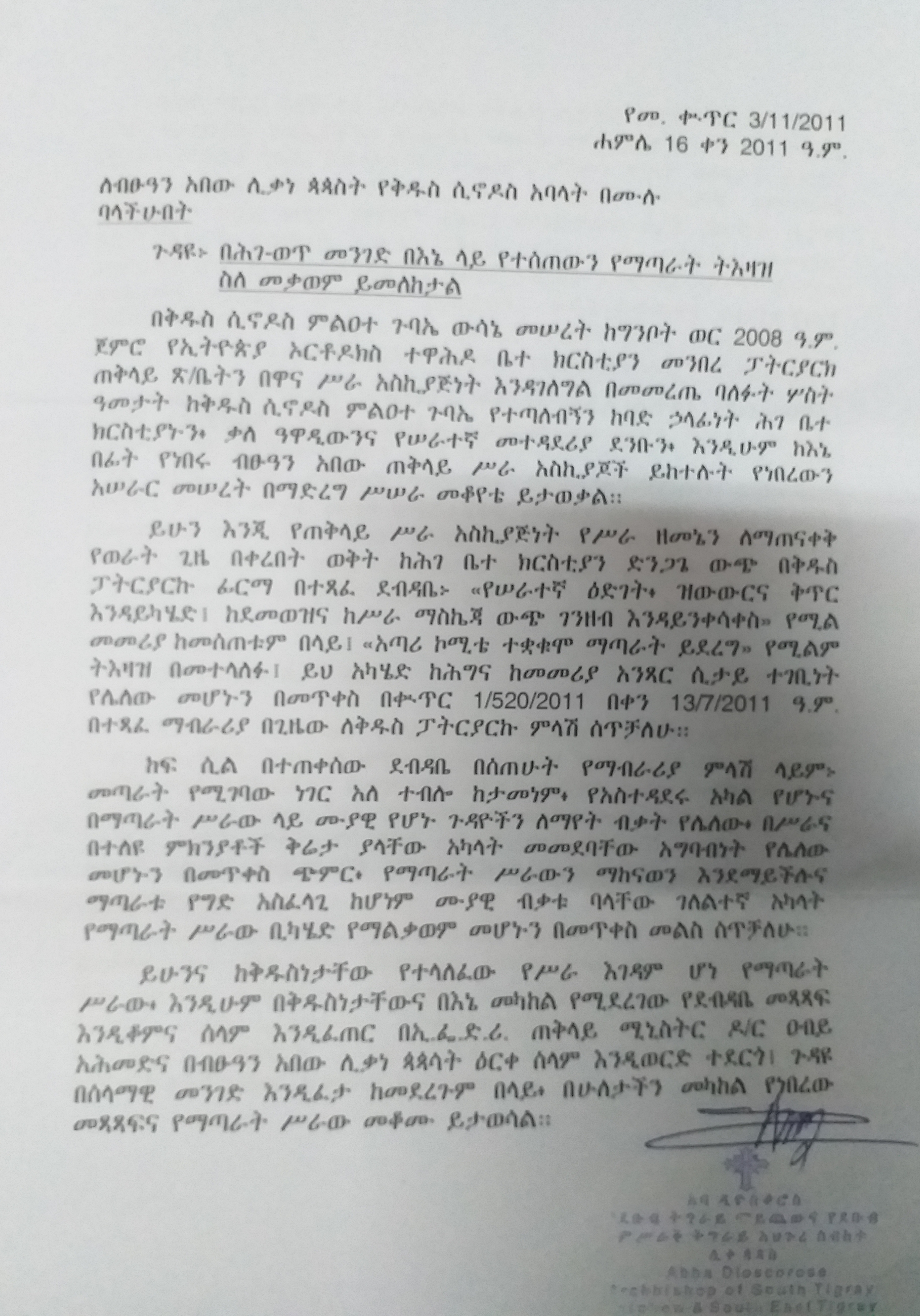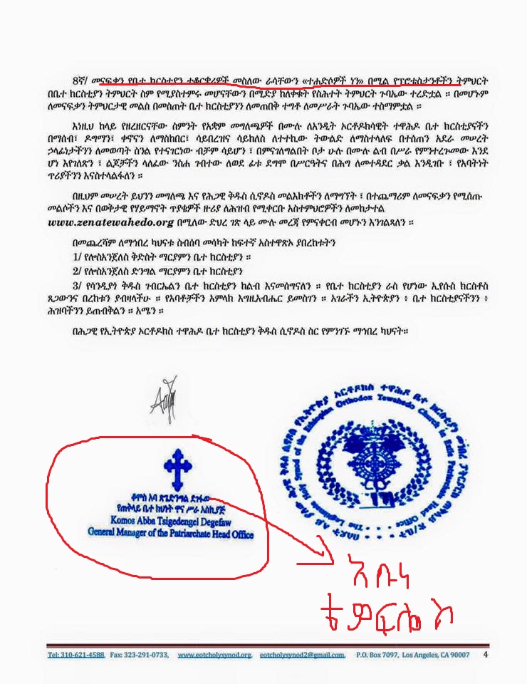 ‹‹ይህ ሥነ ምግባሩ የተበላሸ፣ ቀኖና ቤ/ክን ያፈረሰ፣ በወሲብ ቅሌትና በዝሙት ኃጢአት እግዚአብሔር ለማይድን በሽታ አሳልፎ የሰጠው ሲሆን …ይህ ግለሰብ ለዚህ የዋና ሥራ አስኪያጅነት ሥልጣን የሚያበቃው መንፈሳዊ ሕይወትም ይሁን ሥጋዊ ጤንነት እንዲሁም የስራ ልምድ የሌለው በመሆኑ ቅድስት ቤተክርስቲያናችንን በሚሊንየሙ ድፍን አንደ ሺህ ዓመት ያላጋጠማትን ፈተና አሁን እየተጋፈጠች ትገኛለችና ብጹአን አበው ሊቃነ ጳጳሳት ካህናትና ምዕመናን በጸሎትና በጾም ሊያስወግዱት የሚገባ ልቡሰ ሥጋ ሰይጣን ነው፡፡…..››