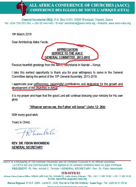 7. በአፍሪካ አብያተ ክርስቲያናት ጉባኤ የተጻፈላቸው የአድናቆት ደብዳቤ ከላይ በሐራውያን የተነሳውን ፍሬ አልባ ክስ ውድቅ የሚያደርግ ነው፡፡
